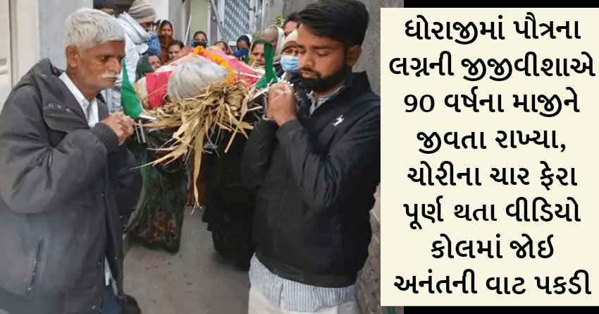 ધોરાજીના સુપેડી ગામમાં રહેતા 90 વર્ષના જીવતીમાએ પોતાના લાડકવાયા પૌત્રના લગ્ન નિહાળવાના અભરખા સાથે આંગણે આવેલા મોતને થોડી કલાકો થોભાવી દીધું હતું. પૌત્રના ચોરીના ચાર ફેરા પૂર્ણ થયાનો વીડિયો જોયા બાદ જીવતીમાએ અનંતની વાટ પકડી હતી. આથી પરિવારમા ‘કભી ખુશી કભી ગમ’નો માહોલ જોવા મળ્યો હતો.