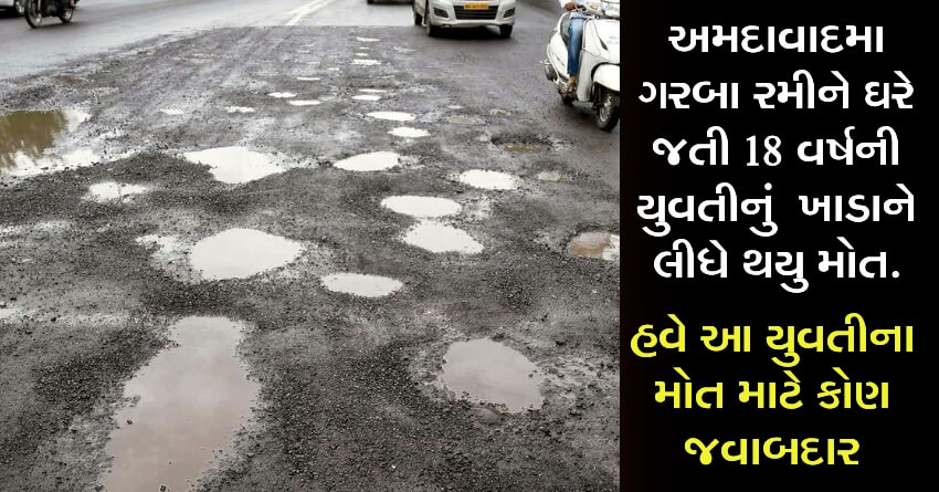 અમદાવાદમાં વરસાદ બાદ રસ્તાઓની હાલત બિસ્માર થઈ ગઈ છે. અમદાવાદના મ્યુનિસિપલ કમિશનર વિજય નહેરાએ અધિકારીઓને ખખડાવી રસ્તાઓ સુધારવા માટે જણાવ્યું હતું. તેમ છતાં પણ અમદાવાદના રસ્તાઓ પર ખાડાઓની ભરમાર છે. ત્યારે આજ ખાડાને કારણે એક 18 વર્ષીય યુવતીનું મોત નિપજ્યું છે. ગરબા રમીને એક્ટિવા લઈ ઘરે પરત જતી યુવતી ખાડાને કારણે પડી ગઈ હતી. જેને માથામાં ગંભીર ઈજા થતાં તેનું મોત નિપજ્યું હતું. હવે આ યુવતીના મોત માટે કોણ જવાબદાર, અમદાવાદના મેયર કે મ્યુનિસિપલ કમિશનર?