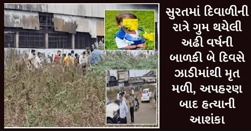 સુરતમાં દિવાળીની રાત્રે ગુમ થયેલી અઢી વર્ષની બાળકી બે દિવસે ઝાડીમાંથી મૃત મળી, અપહરણ બાદ હત્યાની આશંકા