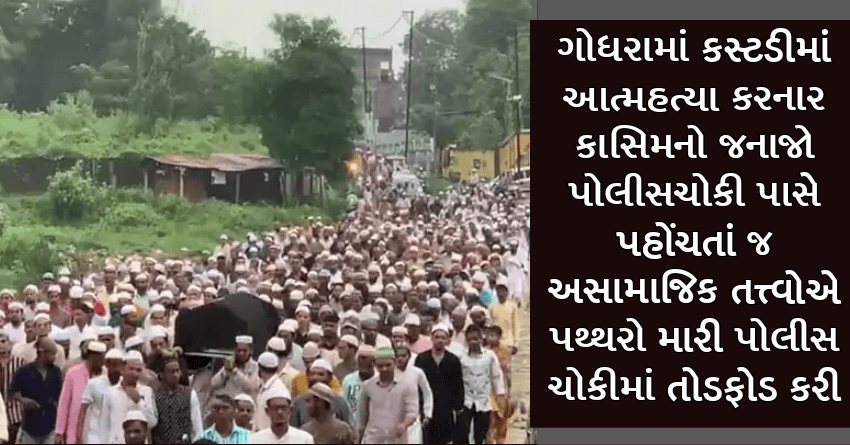 ગોધરામાં કસ્ટડીમાં આત્મહત્યા કરનાર કાસિમનો જનાજો પોલીસચોકી પાસે પહોંચતાં જ અસામાજિક તત્ત્વોએ પથ્થરો મારી પોલીસ ચોકીમાં તોડફોડ કરી