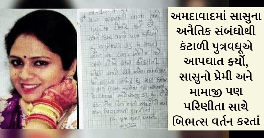 અમદાવાદમાં સાસુના અનૈતિક સંબંધોથી કંટાળી પુત્રવધૂએ આપઘાત કર્યો, સાસુનો પ્રેમી અને મામાજી પણ પરિણીતા સાથે બિભત્સ વર્તન કરતાં