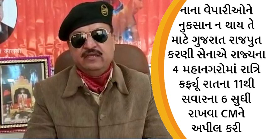 નાના વેપારીઓને નુકસાન ન થાય તે માટે ગુજરાત રાજપુત કરણી સેનાએ રાજ્યના 4 મહાનગરોમાં રાત્રિ કર્ફ્યૂ રાતના 11થી સવારના 6 સુધી રાખવા CMને અપીલ કરી
