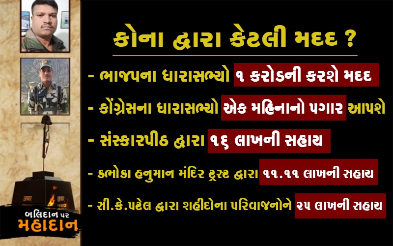 તો બીજી તરફ ડભોડા હનુમાન મંદિર ટ્રસ્ટ દ્વારા પણ શહીર જવાનોના પરિવારની મદદ માટે 11.11 લાખ રૂપિયાની સહાય કરવામાં આવી છે.