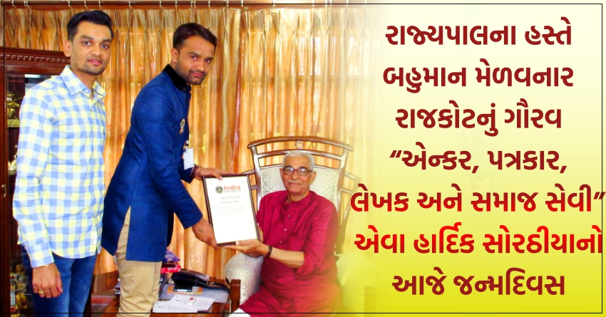 રાજ્યપાલના હસ્તે બહુમાન મેળવનાર રાજ્કોટનું ગૌરવ “એન્કર, પત્રકાર, લેખક અને સમાજ સેવી”, મવડી ગામ ના વતની એવા હાર્દિક સોરઠીયા નો ૨૪ તારીખે જન્મદિન – ૨૬ માં વર્ષે મંગલ પ્રવેશ.