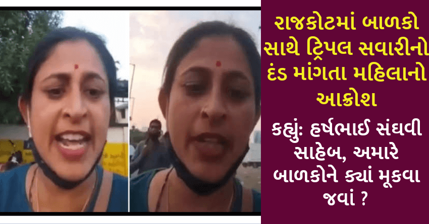 રાજકોટમાં બાળકો સાથે ટ્રિપલ સવારીનો દંડ માંગતા મહિલાનો આક્રોશ, કહ્યું: હર્ષભાઈ સંઘવી સાહેબ, અમારે બાળકોને ક્યાં મૂકવા જવાં?