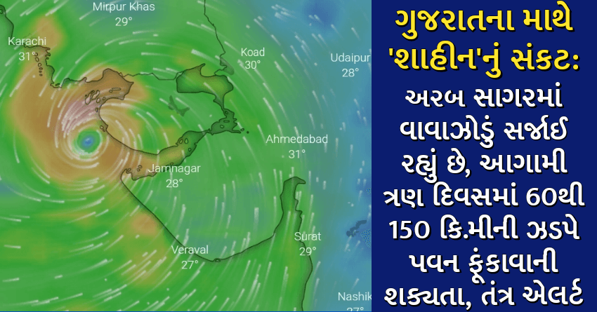 ગુજરાતના માથે ‘શાહીન’નું સંકટ: અરબ સાગરમાં વાવાઝોડું સર્જાઈ રહ્યું છે, આગામી ત્રણ દિવસમાં 60થી 150 કિ.મીની ઝડપે પવન ફૂંકાવાની શક્યતા, તંત્ર એલર્ટ