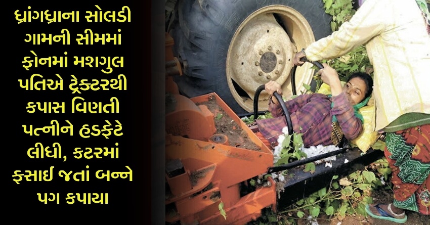 ધ્રાંગધ્રાના સોલડી ગામની સીમમાં પતિ-પત્ની કપાસની સાઠીયું પાડી રહ્યા હતા. આ સમયે ટ્રેક્ટર ચલાવતા પતિ મોબાઇલમાં વાત કરવા જતા પત્નીને ટ્રેક્ટરની અડફેટે લેતાં કટરમાં ફસાઇ ગઈ હતી, જેથી બંન્ને પગ કપાઇ ગયા હતા. પત્નીની બૂમો સાંભળી પતિએ ટ્રેક્ટર બંધ કરી દીધુ હતુ. આસપાસના લોકોની મદદથી એક કલાકની મહેનત બાદ મહિલાને બહાર કાઢી હતી.
