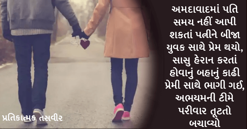 અમદાવાદમાં પતિ સમય નહીં આપી શકતાં પત્નીને બીજા યુવક સાથે પ્રેમ થયો, સાસુ હેરાન કરતાં હોવાનું બહાનું કાઢી પ્રેમી સાથે ભાગી ગઈ, અભયમની ટીમે પરીવાર તૂટતો બચાવ્યો