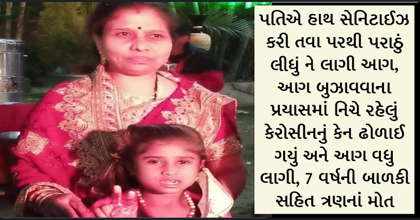 પતિએ હાથ સેનિટાઈઝ કરી તવા પરથી પરાઠું લીધું ને લાગી આગ, આગ બુઝાવવાના પ્રયાસમાં નિચે રહેલું કેરોસીનનું કેન ઢોળાઈ ગયું અને આગ વધુ લાગી, 7 વર્ષની બાળકી સહિત ત્રણનાં મોત