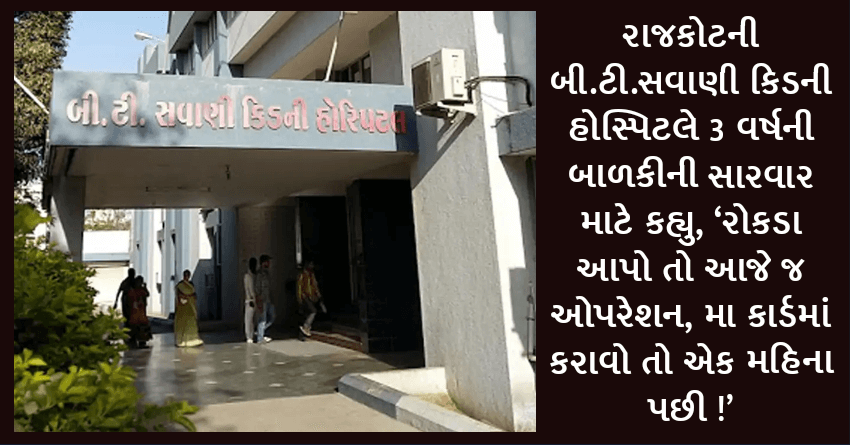 રાજકોટની બી.ટી.સવાણી કિડની હોસ્પિટલે 3 વર્ષની બાળકીની સારવાર માટે કહ્યુ, ‘રોકડા આપો તો આજે જ ઓપરેશન, મા કાર્ડમાં કરાવો તો એક મહિના પછી !’
