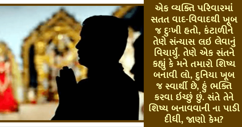 એક વ્યક્તિ પરિવારમાં સતત વાદ-વિવાદથી ખૂબ જ દુઃખી હતો, કંટાળીને તેણે સંન્યાસ લઇ લેવાનું વિચાર્યું. તેણે એક સંતને કહ્યું કે મને તમારો શિષ્ય બનાવી લો, દુનિયા ખૂબ જ સ્વાર્થી છે, હું ભક્તિ કરવા ઇચ્છું છું. સંતે તેને શિષ્ય બનાવવાની ના પાડી દીધી, જાણો કેમ?
