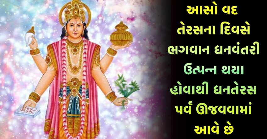 પૌરાણિક માન્યતાઓ પ્રમાણે શરદ પૂર્ણિમાએ ચંદ્ર, વાઘ બારસે કામધેનુ ગાય, તેરસના દિવસે ભગવાન ધનવંતરિ, ચૌદશે માતા કાળી અને અમાસના દિવસે લક્ષ્મી માતા સમુદ્રમાંથી ઉત્પન્ન થયાં હતાં. આસો વદ તેરસના દિવસે ભગવાન ધનવંતરિ ઉત્પન્ન થયા હોવાથી ધનતેરસ પર્વ ઊજવવામાં આવે છે. કહેવાય છે કે, સમુદ્ર મંથન સમયે ધનવંતરિએ સંસારને અમૃક આપ્યું હતું.
