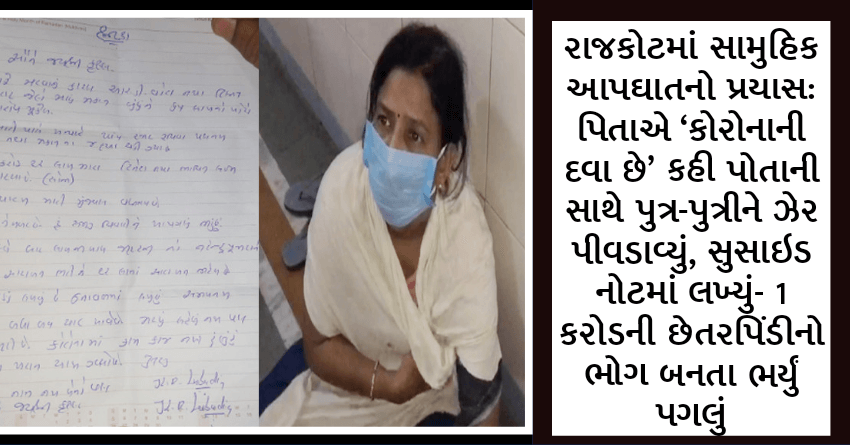 રાજકોટમાં સામુહિક આપઘાતનો પ્રયાસ: પિતાએ ‘કોરોનાની દવા છે’ કહી પોતાની સાથે પુત્ર-પુત્રીને ઝેર પીવડાવ્યું, સુસાઇડ નોટમાં લખ્યું- 1 કરોડની છેતરપિંડીનો ભોગ બનતા ભર્યું પગલું