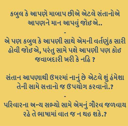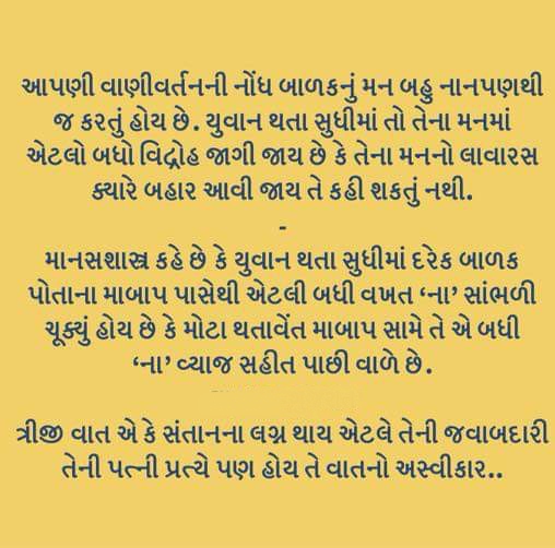 ⭐ માનસશાસ્ત્ર કહે છે કે યુવાન થતા સુધીમાં દરેક બાળક પોતાના માબાપ પાસેથી એટલી બધી વખત ‘ના’ સાંભળી ચૂક્યું હોય છે કે મોટા થતાવેંત માબાપ સામે તે એ બધી ‘ના’ વ્યાજ સહીત પાછી વાળે છે.