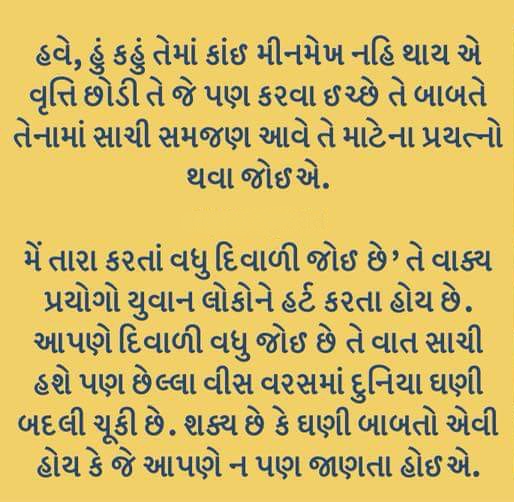 🌹 ‘મેં તારા કરતાં વધુ દિવાળી જોઈ છે’ તે વાક્ય પ્રયોગો યુવાન લોકોને હર્ટ કરતા હોય છે. આપણે દિવાળી વધુ જોઈ છે તે વાત સાચી હશે પણ છેલ્લા વીસ વરસમાં દુનિયા ઘણી બદલી ચૂકી છે. શક્ય છે કે ઘણી બાબતો એવી હોય કે જે આપણે ન પણ જાણતા હોઈએ.