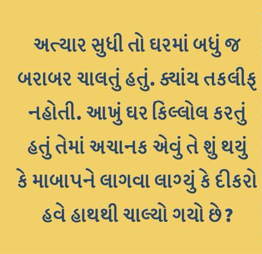 👉અત્યાર સુધી તો ઘરમાં બધું જ બરાબર ચાલતું હતું. ક્યાંય તકલીફ નહોતી. આખું ઘર કિલ્લોલ કરતું હતું તેમાં અચાનક એવું તે શું થયું કે માબાપને લાગવા લાગ્યું કે દીકરો હવે હાથથી ચાલ્યો ગયો છે?
