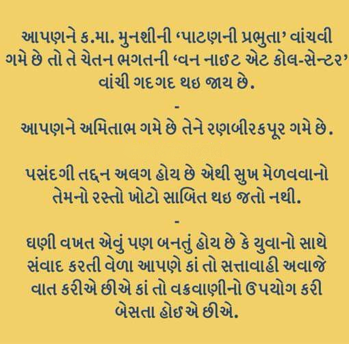 🌹આપણને ક.મા. મુનશીની ‘પાટણની પ્રભુતા’ વાંચવી ગમે છે તો તે ચેતન ભગતની ‘વન નાઈટ એટ કોલ-સેન્ટર’ વાંચી ગદગદ થઇ જાય છે.