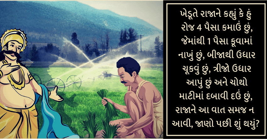 ખેડૂતે રાજાને કહ્યું કે હું રોજ 4 પૈસા કમાઉં છું, જેમાંથી 1 પૈસા કૂવામાં નાખું છું, બીજાથી ઉધાર ચૂકવું છું, ત્રીજો ઉધાર આપું છું અને ચોથો માટીમાં દબાવી દઉં છું