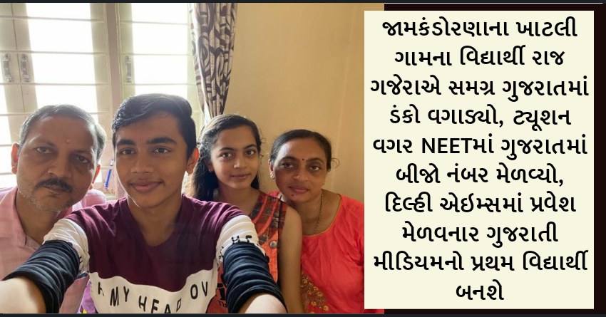 જામકંડોરણાના ખાટલી ગામના વિદ્યાર્થી રાજ ગજેરાએ સમગ્ર ગુજરાતમાં ડંકો વગાડ્યો, ટ્યૂશન વગર NEETમાં ગુજરાતમાં બીજો નંબર મેળવ્યો, દિલ્હી એઇમ્સમાં પ્રવેશ મેળવનાર ગુજરાતી મીડિયમનો પ્રથમ વિદ્યાર્થી બનશે