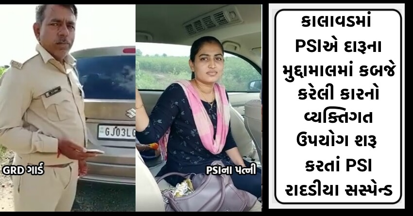 ઉલ્લેખનીય છે કે કાલાવડ ગ્રામ્ય પોલીસ સ્ટેશનમાં તારીખ 26-8-2020ના રોજ ઇંગ્લિશ દારૂ અંગેનો એક કેસ કરવામાં આવ્યો હતો. જેમાં GJ-3-LG-8413 નંબરની કાર દારૂના જથ્થા સાથે કબજે કરીને પોલીસ સ્ટેશનમાં રાખવામાં આવી હતી. જે કાર દોઢ મહિનાથી પોલીસ સ્ટેશનમાં પડી હતી. દરમિયાન કાલાવડ ગ્રામ્યના PSI રાદડિયા તથા અન્ય પોલીસ સ્ટાફ દ્વારા કારનો દુરુપયોગ કરવામાં આવ્યો હતો. પોલીસ અધિકારી દ્વારા પોતાના અંગત ઉપયોગમાં લેવામાં આવતો હોવાની માહિતી કારના માલિકને મળતા સમગ્ર મામલો સામે આવ્યો હતો.