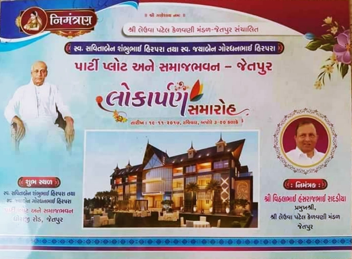 ધોરાજી રોડ ઉપર લેઉવા પટેલ કેળવણી મંડળ સંચાલિત સ્વ. સવિતાબેન શંભુભાઈ હિરપરા તથા સ્વ. જયાબેન ગોરધનભાઈ હિરપરા પાર્ટી પ્લોટ તેમજ વિશાળ સમાજ બન્યો ત્યારે પુરા ગુજરાતમાં સૌપ્રથમ જેતપુરમાં અત્યાધુનિક સુવિધા જનક વિઠ્ઠલભાઈ રાદડિયા ના માર્ગદર્શન હેઠળ તૈયાર કરવામાં આવ્યો છે. લેઉવા પટેલ સમાજના નાનામાં નાના લોકોને પોતાના દિકરી-દિકરાના પ્રસંગોમાં સારી ભૌતિક સુવિધા પ્રાપ્ત થઈ શકે તેવા આશયથી આધુનિક પાર્ટી પ્લોટનુ નિર્માણ 33 કરોડ રૂપિયા ના ખર્ચે કરવામાં આવ્યું છે..