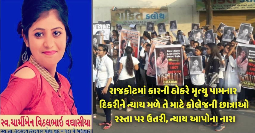 રાજકોટમાં વીરબાઇ મહિલા કોલેજમાં અભ્યાસ કરતી વિદ્યાર્થિની ચાર્મી વિઠલભાઇ વઘાસીયા બે સહેલી સાથે કોલેજ જવા માટે બસસ્ટોપ સુધી ચાલીને જતી હતી ત્યારે પાછળથી ચાર્મી મોદી નામની કાર ચાલકે ઠોકરે લીધી હતી. અકસ્માતમાં ચાર્મી વઘાસિયાનું ઘટનાસ્થળે મોત નીપજ્યું હતું. આજે મોટી સંખ્યામાં વીરબાઇ મહિલા કોલેજની વિદ્યાર્થિનીઓ બેનરો સાથે રસ્તા પર ઉતરી આવી હતી અને ન્યાય આપોના નારા લગાવ્યા હતા. વિદ્યાર્થિનીઓ સાથે મોટી સંખ્યામાં લોકો પણ જોડાયા હતા અને ઇન્દિરા સર્કલે ચક્કાજામ કર્યો હતો.