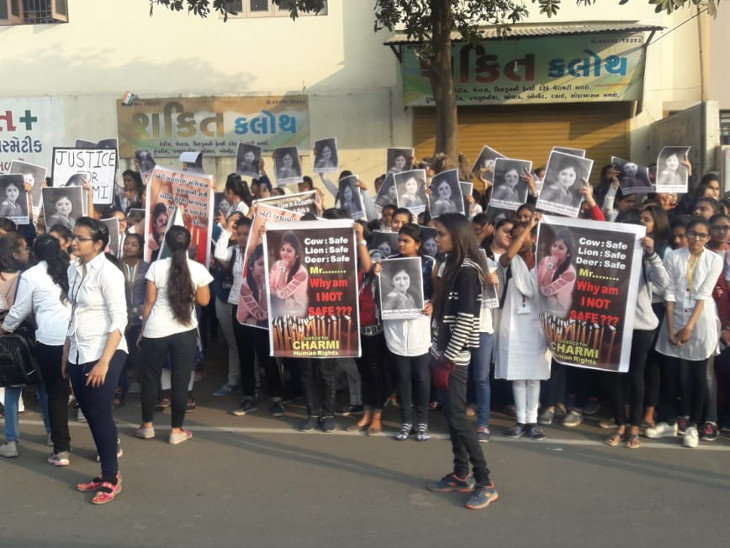 રાજકોટમાં કારની ઠોકરે મૃત્યુ પામનાર દિકરીને ન્યાય મળે તે માટે કોલેજની છાત્રાઓ રસ્તા પર ઉતરી, ન્યાય આપોના નારા