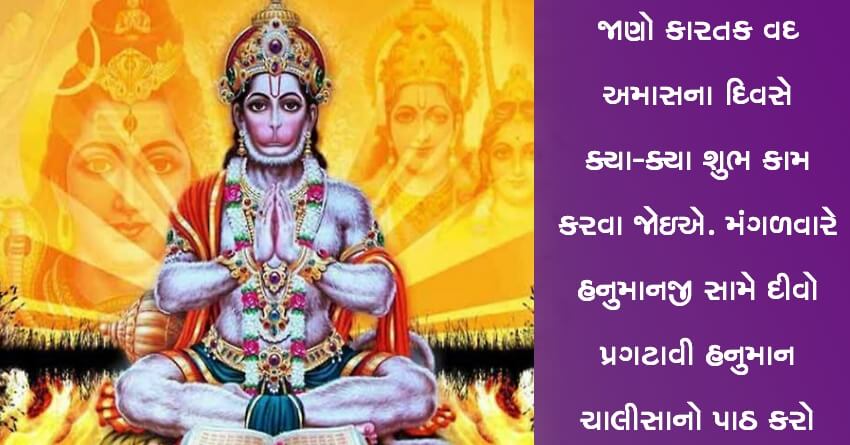 જાણો કારતક વદ અમાસના દિવસે ક્યા-ક્યા શુભ કામ કરવા જોઇએ. મંગળવારે હનુમાનજી સામે દીવો પ્રગટાવી હનુમાન ચાલીસાનો પાઠ કરો