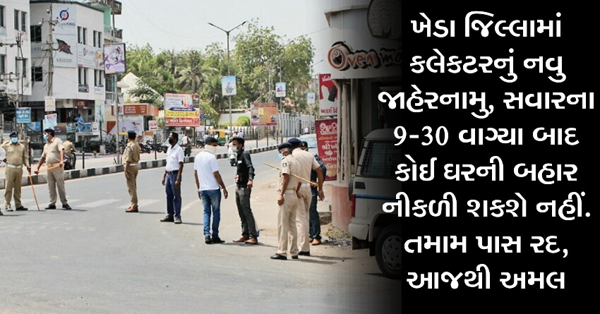 ખેડા જિલ્લામાં કલેકટરનું નવુ જાહેરનામુ, સવારના 9-30 વાગ્યા બાદ કોઈ ઘરની બહાર નીકળી શકશે નહીં. તમામ પાસ રદ, આજથી અમલ