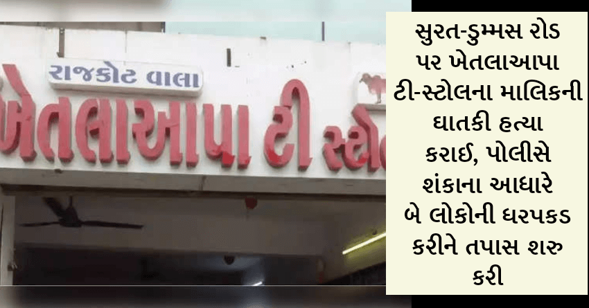 સુરત-ડુમ્મસ રોડ પર ખેતલાઆપા ટી-સ્ટોલના માલિકની ઘાતકી હત્યા કરાઈ, પોલીસે શંકાના આધારે બે લોકોની ધરપકડ કરીને તપાસ શરુ કરી