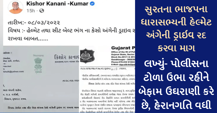 સુરતના ભાજપના ધારાસભ્યની હેલ્મેટ અંગેની ડ્રાઇવ રદ કરવા માગ, લખ્યું- પોલીસના ટોળા ઉભા રહીને બેફામ ઉઘરાણી કરે છે, હેરાનગતિ વધી