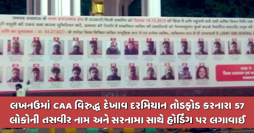 લખનઉમાં CAA વિરુદ્ધ દેખાવ દરમિયાન તોડફોડ કરનારા 57 લોકોની તસવીર નામ અને સરનામા સાથે હોર્ડિંગ પર લગાવાઈ, એમની પાસેથી 88 લાખ રૂપિયાની વસુલાત કરાશે