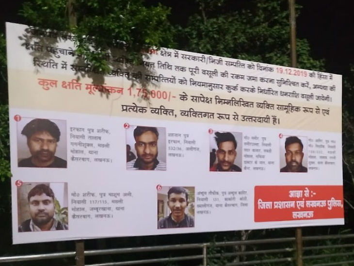 નાગરિકતા સંશોધન કાયદો લાગુ થયા બાદ 19 ડિસેમ્બરે લખનઉમાં થયેલા પ્રદર્શનમાં સાર્વજનિક સંપત્તિને નુકસાન પહોંચાડનારા 57 લોકોની તસવીર, તેમના નામ અને સરનામા સહિત તંત્રે જાહેર કરી દીધી છે. ગુરુવાર રાતે આ હોર્ડિંગ એવા વિસ્તારમાં લગાવાયા છે, જ્યાં તોડફોડ કરાઈ હતી. ડીએમ અભિષેક પ્રકાશે કહ્યું કે, જો નક્કી કરેલા સમયે આ લોકોએ દંડ ન ભર્યો તો તેમની સંપત્તિ જપ્ત કરવામાં આવશે. તંત્રએ હસનગંજ, હજરતગંજ, કેસરબાગ અને ઠાકુરગંજ વિસ્તારમાં 57 લોકો પાસેથી 88,62,537 રૂપિયાની વસુલવામાં આવશે તેવી વાત કરી હતી.