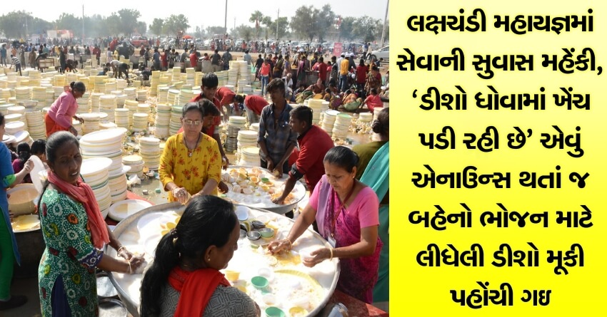 લક્ષચંડી મહાયજ્ઞમાં સેવાની સુવાસ મહેંકી, ‘ડીશો ધોવામાં ખેંચ પડી રહી છે’ એવું એનાઉન્સ થતાં જ બહેનો ભોજન માટે લીધેલી ડીશો મૂકી પહોંચી ગઇ