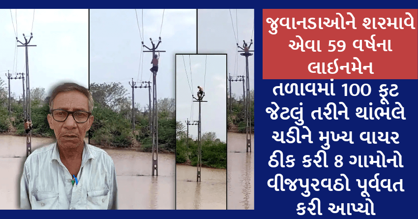 જુવાનડાઓને શરમાવે એવા 59 વર્ષના લાઇનમેન, તળાવમાં 100 ફૂટ જેટલું તરીને થાંભલે ચડીને મુખ્ય વાયર ઠીક કરી 8 ગામોનો વીજપુરવઠો પૂર્વવત કરી આપ્યો
