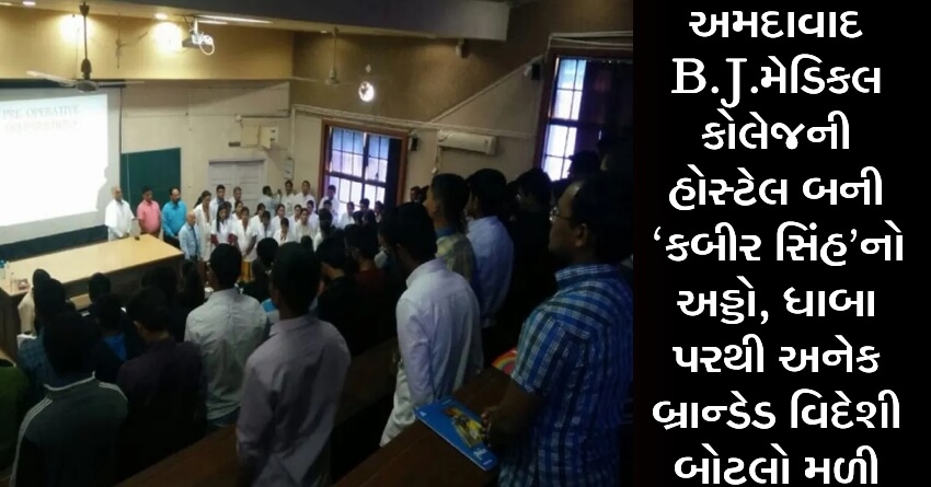 કબીર સિંહ ફિલ્મ તો તમે જોયું જ હશે. જેમાં ડોક્ટર કબીર હંમેશા દારૂના નશામાં ચકચૂર હોય છે. આવા જ ડોક્ટર અમદાવાદની બી.જે. મેડિકલ કોલેજની હોસ્ટેલમાં ઢૂંસીને ઢૂંસીને ભર્યા છે. પોલીસે મેડિકલ કોલેજની હોસ્ટેલનાં ધાબા પરથી અનેક વિદેશી બોટલો ઝડપી પાડી છે. દારૂ પીધા બાદ આ તમામ બોટલોને ધાબા પર ફેંકી દેવામાં આવી હતી. આ મામલે પોલીસે અને કોલેજ સત્તાધીશોએ તપાસનો ધમધમાટ શરૂ કર્યો છે.