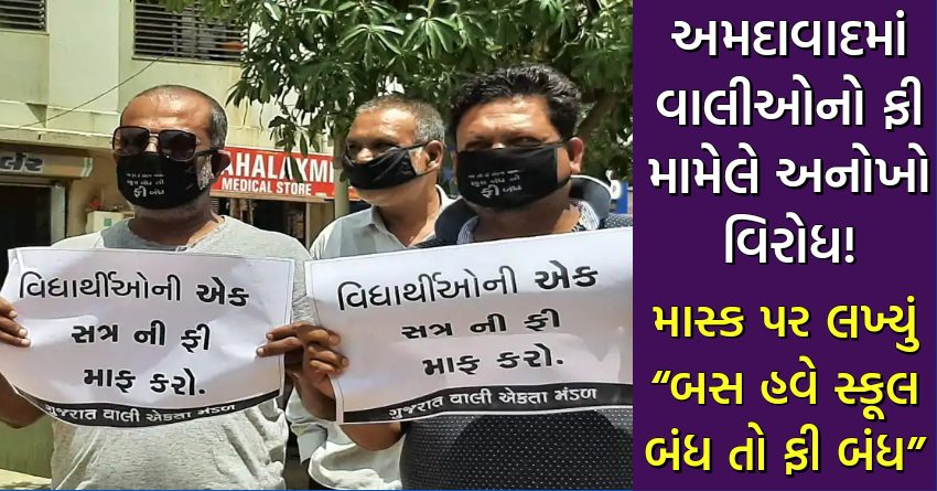અમદાવાદમાં વાલીઓનો ફી મામેલે અનોખો વિરોધ! માસ્ક પર લખ્યું “બસ હવે સ્કૂલ બંધ તો ફી બંધ”