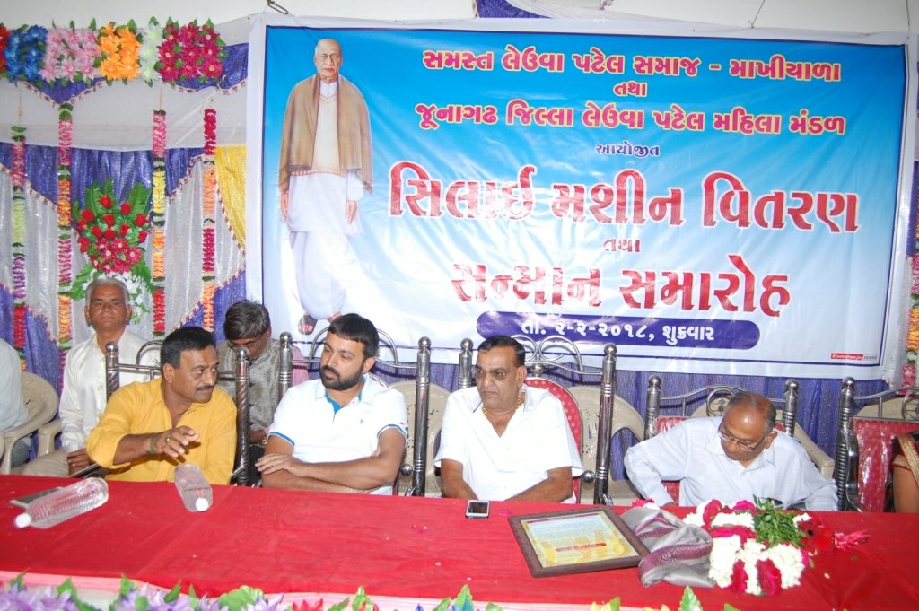 તા 2.2 18ના રોજ માખીયાળા ગામે સમસ્ત લેઉવા પટેલ સમાજ અને જૂનાગઢ જીલ્લા લેઉવા પટેલ મહિલા મંડળ ના ઉપ ક્રમે લેઉવા પટેલ સમાજની જરુયાત અને વિધવા બહેનોને નિ.શુલ્ક શિલાઇ મશીન વિતરણ કરવાનો કાર્યક્રમ યોજાયો હતો. જેમાં દાતાના સહયોગથી આ કાર્યક્રમમાં ખાજહાજર રહેલ કેબીનેટ મંત્રી જયેશભાઇ રાદડીયા, સુરતના ઉધ્ધ્યોગપતિ રમેશભાઇ ગજેરા, ખોડલધામ ટ્રસ્ટના પ્રમુખ પરેશભાઇ ગજેરા, સમાજ અગ્રણી કાનભાઇ કાનગડ, ભીખાભાઇ ગજેરા, ડો.જી.કે ગજેરા, હરસુખભાઇ સોજીત્રા, મંડળ જીલ્લા પ્રમુખ શારદાબેન ગાજીપરા સહેર પ્રમુખ જયશ્રીબેન વેકરીયા, સરપંચ રમેશભાઇ ગજેરા, મંત્રી રુપલબેન વધાસીયા, આરતીબેન ગજેરા, રમણીકભાઇ હિરપરા તેમજ કાર્યક્રમના પ્રણેતા હરસુખભાઇ વધાસીયા એ જણાવેલ બહેનો સમાજમા સ્વમાનભેર જીવી શકે પરિવાર ને ઉપયોગી બની શકે એવા ઉદેશ થી શિલાઇ મશીન આપવામા આવે છેઆજ સુધીમાં શિલાઇ મશીના 77 કાર્યક્રમ જીલ્લાભરમા યોજાયા એમા 3700 જેવા બહેનોને શીલાઇ મશીન આપવામા આવેલ.