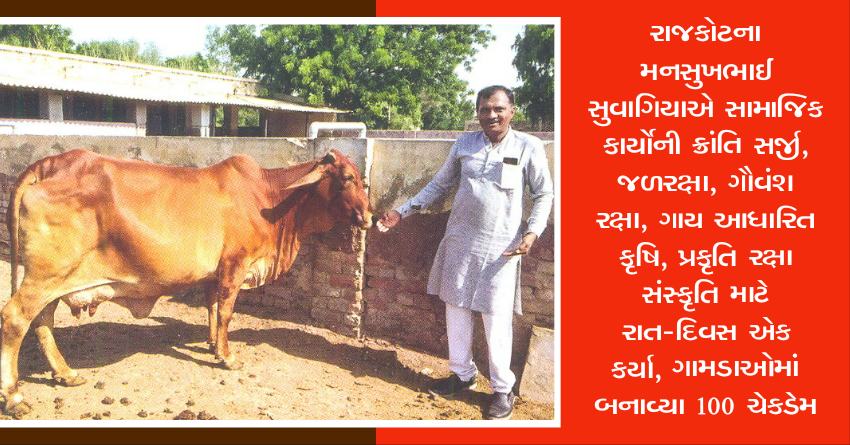 રાજકોટના મનસુખભાઈ સુવાગિયાએ સામાજિક કાર્યોની ક્રાંતિ સર્જી, જળરક્ષા, ગૌવંશ રક્ષા, ગાય આધારિત કૃષિ, પ્રકૃતિ રક્ષા સંસ્કૃતિ માટે રાત-દિવસ એક કર્યા, ગામડાઓમાં બનાવ્યા 100 ચેકડેમ