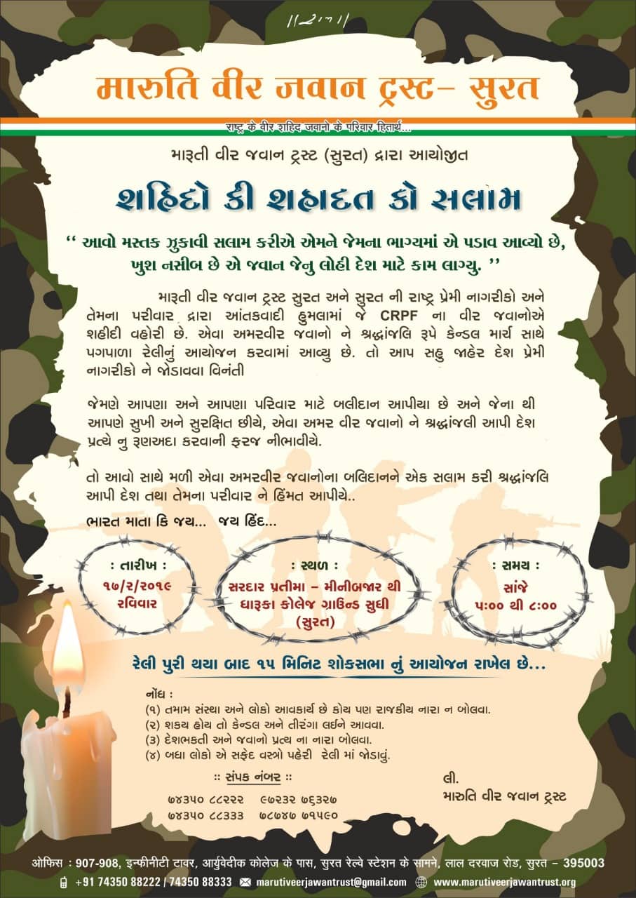 ધર્મનંદન ડાયમંડવાળા લાલજીભાઇ ઉગામેડીએ જણાવ્યું હતું કે, મારૂતિ વીર જવાન ટ્રસ્ટના તમામ ટ્રસ્ટી અને શહેરના અગ્રણીઓ દ્વારા શહીદોને શ્રધ્ધાંજલી આપવામા આવે છે. ઉપરાંત આવતી કાલે રવિવાર તા.17મી ફેબ્રુઆરીના રોજ સાંજે પાંચ વાગ્યાના સુમારે વરાછા રોડ મીની હીરા બજાર ખાતેથી શહીદોને શ્રધ્ધાંજલી આપવા માટે એક કેન્ડલ માર્ચનું આયોજન કરવામાં આવ્યુ છે. આ કેન્ડલ માર્ચ વરાછા રોડ મીની હીરા બજાર ખાતેથી કાપોદ્રા પોલસ સ્ટેશન સામે જે બી ધારૂકાવાલા કોલેજ કેમ્પસમાં પહોંચશે. જ્યાં આ કેન્ડલ માર્ચ સભાના સ્વરૂપમાં ફેરવાશે. કેન્ડલ માર્ચમાં ભાગ લેવા માટે આવનારા તમામ દેશપ્રેમી નાગરિકોને સફેદ વસ્ત્ર પરિધાન કરીને આવવા માટે પણ વિનંતી કરવામાં આવી છે. આ કોન્ફરન્સમાં મથુરભાઇ સવાણી, લવજીભાઇ બાદશાહ સહિત ટ્રસ્ટના અગ્રણીઓ ઉપસ્થિત રહ્યા હતા.