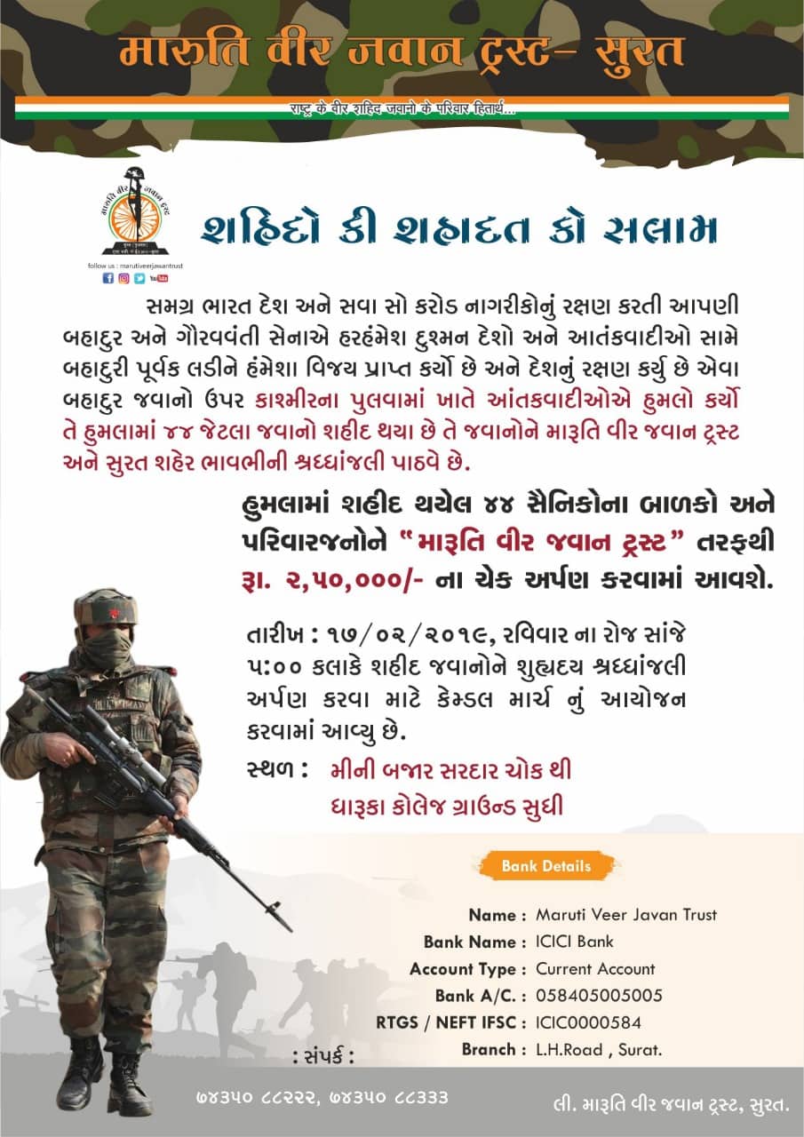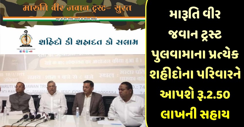 આ અંગે વિગતો આપતા મારૂતિ વીર જવાન ટ્રસ્ટના પ્રમુખ નનુભાઇ સાવલિયાએ જણાવ્યું હતું કે, દેશના વીર જવાનો જ્યારે શહીદ થાય ત્યારે તેમના પરિવારની ચિંતા કરીને તેમને આર્થિક સહાય આપવાના હેતુસર જ સુરત શહેરમાં મારૂતિ વીર જવાન ટ્રસ્ટની સ્થાપના કરવામાં આવી છે. આ શહીદોના પરિવારોને આર્થિક રીતે મદદ રૂપ થવા માટે જ વર્ષ 2017માં પુજ્ય મોરારિબાપુની રામકથાનું આયોજન સુરતના આંગણે કરવામાં આવ્યું હતું અને તેના માધ્યમથી ફંડ એકત્ર કરવામાં આવ્યુ છે. આજે જ્યારે કાશ્મીરના પુલવામા આતંકવાદી હુમલામાં સીઆરપીએફના 44 જવાનો શહીદ થયા છે ત્યારે એક નાગરિક તરીકે આપણું મસ્તક આ વીર જવાનોની શહાદત સામે નમી જાય છે. આ તમામ વીર સપુતોના પરિવારોને આર્થિક સહાય આપવા માટે મારૂતિ વીર જવાન ટ્રસ્ટ દ્વારા નિર્ધાર કરવામાં આવ્યો છે અને પ્રત્યેક શહીદના પરિવારજનોને રૂપિયા 2.50 લાખની સહાય કરવામાં આવશે. આમ કુલ 44 શહીદોના પરિવારને મારૂતિ વીર જવાન ટ્રસ્ટ દ્વારા કુલ રૂપિયા એક કરોડ દસ લાખની સહાય આપવામાં આવશે. આ તમામ પરિવારજનોને ટ્રસ્ટ દ્વારા ચેક થી સહાય ચુકવવામાં આવશે અને અનુકુળતા પ્રમાણે ટ્રસ્ટીઓ અને સમાજના અગ્રણીઓ શહીદોના પરિવારોને રૂબરૂ મળીને આ સહાયતા ચુકવશે.