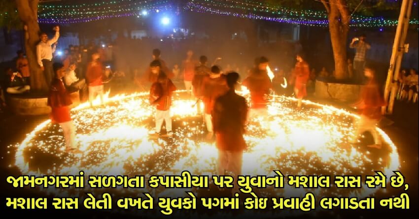 જામનગરમાં સળગતા કપાસીયા પર યુવાનો મશાલ રાસ રમે છે, મશાલ રાસ લેતી વખતે યુવકો પગમાં કોઇ પ્રવાહી લગાડતા નથી