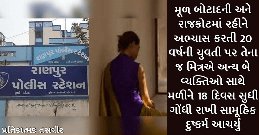 મૂળ બોટાદની અને રાજકોટમાં રહીને અભ્યાસ કરતી 20 વર્ષની યુવતી પર તેના જ મિત્રએ અન્ય બે વ્યક્તિઓ સાથે મળીને 18 દિવસ સુધી ગોંધી રાખી સામૂહિક દુષ્કર્મ આચર્યું