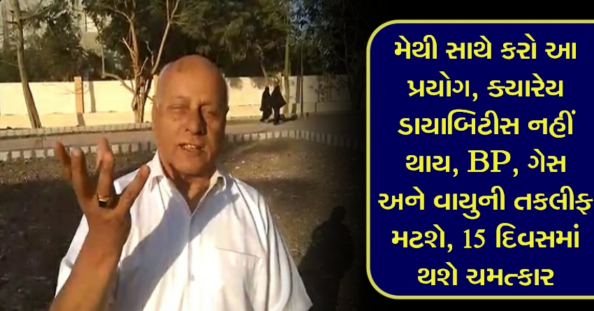 વેરાવળના સિનિયર સિટીજન, સામાજિક કાર્યકર અને યોગા ટ્રેનર ખેતસીભાઈ મૈઠિયાએ મેથીના પ્રયોગનો એક વીડિયો શેર કર્યો છે. પાણી સાથે મેથીનો આ પ્રયોગ કરવાથી શરીરમાં ચમત્કારિક અસર થાય છે. આ આસાન પ્રયોગથી ડાયાબિટીસ થવાની શક્યતા ખૂબ જ ઘટી જાય છે. એટલું જ નહીં જે લોકોને બ્લડ પ્રેસર, ગેસ, વાયુ અને એસિડીટીનો પ્રોબ્લેમ હોય તે પણ દૂર થાય છે. ખેતસીભાઈનું કહેવું છે કે, આ રીતે રોજ મેથી લેવામાં આવે તો સાંધા અને કમરનો દુખાવો પણ મટી શકે છે.