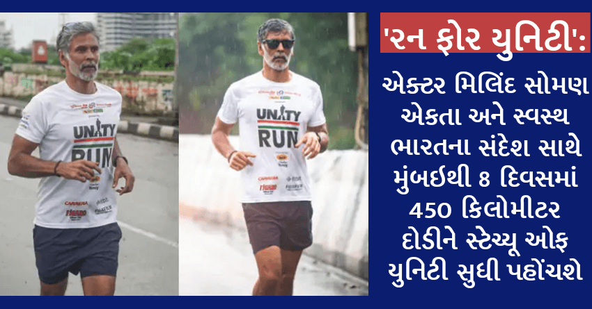 ‘રન ફોર યુનિટી’: એક્ટર મિલિંદ સોમણ એકતા અને સ્વસ્થ ભારતના સંદેશ સાથે મુંબઇથી 8 દિવસમાં 450 કિલોમીટર દોડીને સ્ટેચ્યૂ ઓફ યુનિટી સુધી પહોંચશે