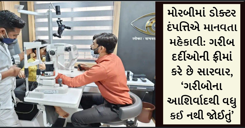 મોરબીમાં ડોકટર દંપતિનું માનવીય કાર્ય સામે આવ્યું છે. આ દંપતિએ ગરીબ પરિવારોના દર્દીઓને ફ્રીમાં સારવાર આપવાનો સંકલ્પ કર્યો છે. દિવાળી પર પણ ફ્રી સારવાર આપી ડોક્ટરે માનવતા મહેકાવી છે. મોરબીમાં આંખની ગરીબો માટે મફત સારવાર કરી રહ્યા છે. દિવાળીના તહેવારોમાં તેમણે 60થી વધુ દર્દીઓની ફ્રીમાં સારવાર કરી હતા, જ્યારે ગરીબ પરિવારના 1100 લોકોને ઓપરેશનની ફ્રી સારવાર આપી માનવતા મહેકાવી દીધી છે.