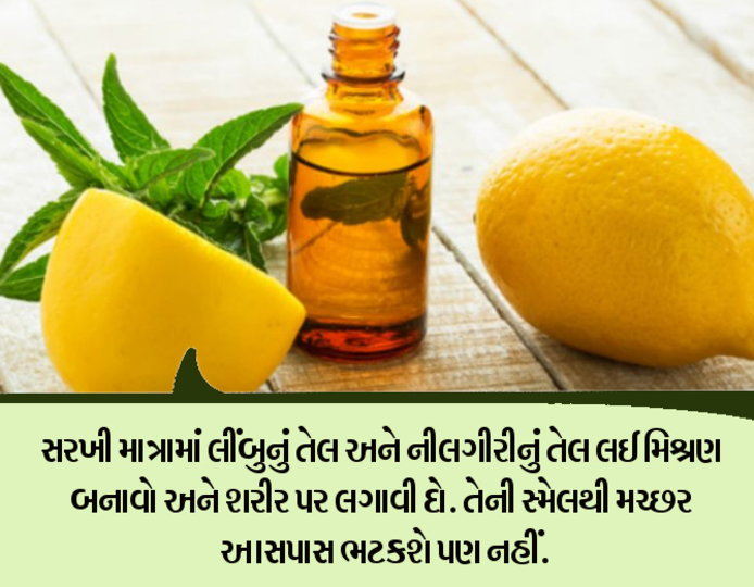 પૂરતા પ્રમાણમા નીલગિરીના તેલ અને લીંબુના તેલને લઇને તેનુ મિશ્રણ તૈયાર કરી લો. હવે તેને શરીર પર લગાવો. તેની સુગંધથી મચ્છર તમારી આસપાસ પણ આવશે નહીં.