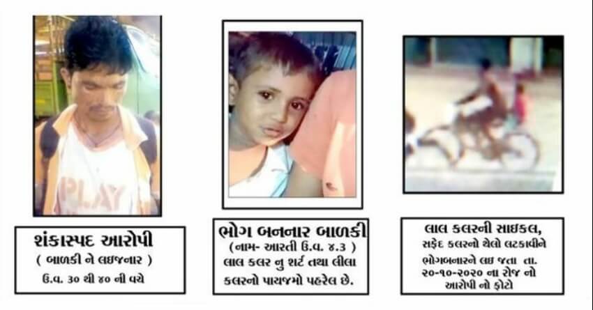 પિતાએ ફરિયાદમાં જણાવ્યું હતું કે, દીકરી આરતીએ લાલ કલરનો શર્ટ અને લીલા કલરનો પાયજામો પહેર્યો છે. બાળકીના અપહરણની આશંકા સાથે પિતાની ફરિયાદ મળતા જ પોલીસે તપાસ હાથ ધરી હતી. જેમાં પોલીસે તપાસ કરતા એક શંકાસ્પદ યુવક સામે આવ્યો છે. જ્યારે આ શંકાસ્પદ યુવક બાળકીને સાઈકલ પર લઈ જતો પણ સીસીટીવીમાં કેદ થયો છે. હાલ પોલીસ ટીમે બનાવી બાળકીની શોધખોળ કરી રહી છે. આ સાથે સોશિયલ મીડિયામાં બાળકી, શંકાસ્પદ આરોપીની તસવીરો પણ વાઈરલ કરી છે.