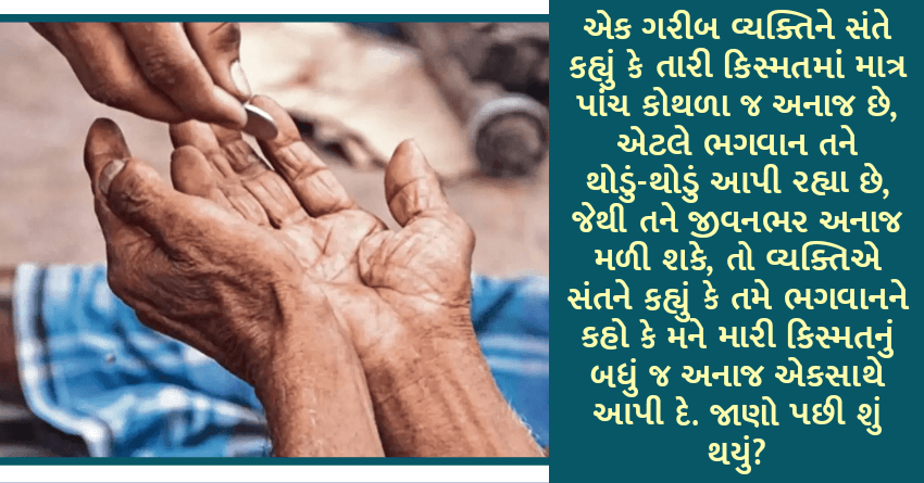એક ગરીબ વ્યક્તિને સંતે કહ્યું કે તારી કિસ્મતમાં માત્ર પાંચ કોથળા જ અનાજ છે, એટલે ભગવાન તને થોડું-થોડું આપી રહ્યા છે, જેથી તને જીવનભર અનાજ મળી શકે, તો વ્યક્તિએ સંતને કહ્યું કે તમે ભગવાનને કહો કે મને મારી કિસ્મતનું બધું જ અનાજ એકસાથે આપી દે. જાણો પછી શું થયું?