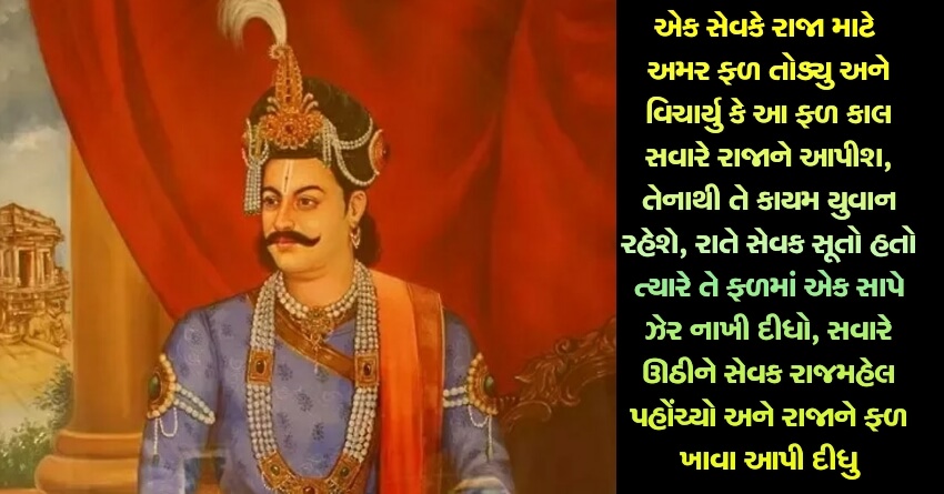 એક સેવકે રાજા માટે અમર ફળ તોડ્યુ અને વિચાર્યુ કે આ ફળ કાલ સવારે રાજાને આપીશ, તેનાથી તે કાયમ યુવાન રહેશે, રાતે સેવક સૂતો હતો ત્યારે તે ફળમાં એક સાપે ઝેર નાખી દીધો, સવારે ઊઠીને સેવક રાજમહેલ પહોંચ્યો અને રાજાને ફળ ખાવા આપી દીધુ